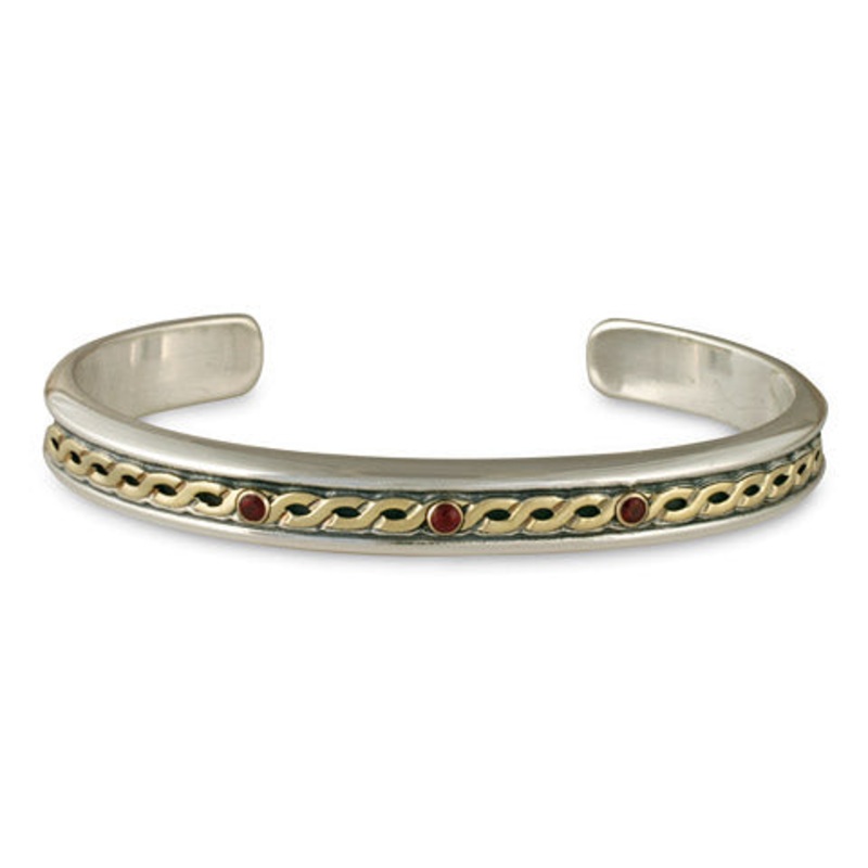 Our delightfully beautiful Rope Cuff Bracelet with Stone, suitable for both men and women, is durable enough to wear all the time. Shown with three 2.5mm rubies, it is also available with other precious gems. Call for prices in tanzanite or diamond. The design is symbolic of the harmonious waving together of two paths or two points of view.