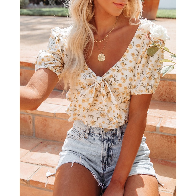 Have a sun soaked Spring in the Rosemarie Floral Tie Front Crop Top in cream, yellow, sage, olive, and orange thats detailed with ruffle tiers and puff sleeves.