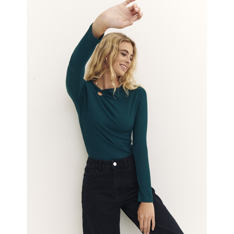 Give your basics selection a boost with the Rosetta top in black. The jersey top features a ring cut out on the chest with ruching, long sleeves and a cool ribbed finish. Tuck into your favourite pair of NC jeans for daytime dressing made easy.