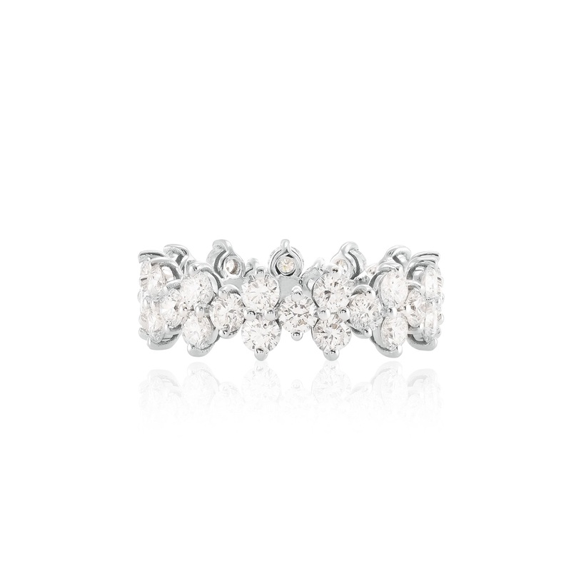 A stunning round brilliant diamond full eternity ring, with 2.60cts collection color diamonds styled in a shared prong hand made setting and mounted in 18K white gold.