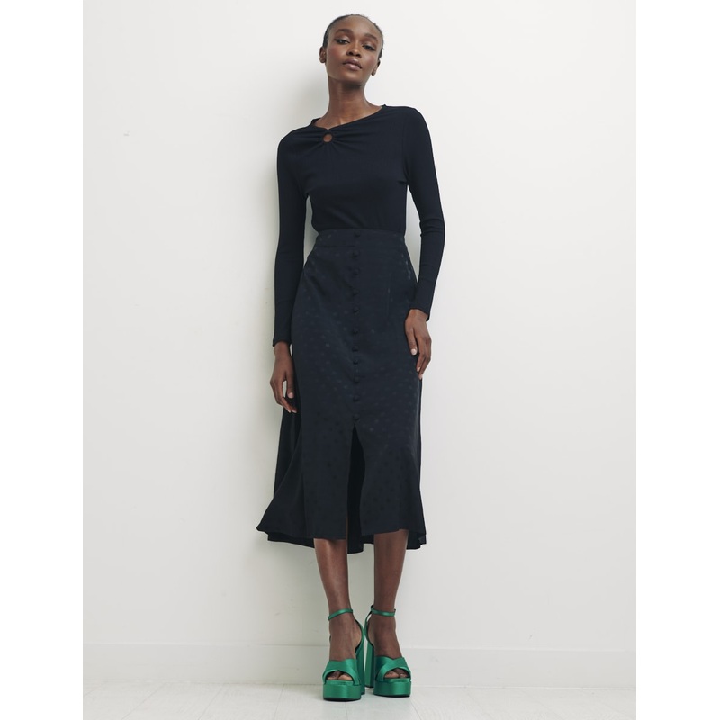 New skirt alert, this time in the form of the Sadie. A black midi made for special occasions boasts a front slit and is adorned by a subtle spotted print. Buttons line the front of this swishy piece and the nipped-in waist falls to a loose silhouette. Team with heels for a look you’ll love.