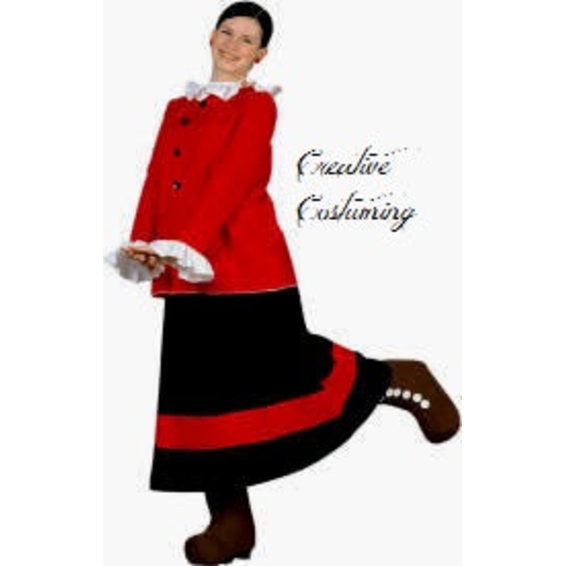 Includes: Long red top with light pink ruffled neck and cuffs, long black skirt with red stripe and adjustable waist tie, boot covers. Shirt and skirt have slight stretch and are meant to be loose fitting.Machine Wash /100% nylon