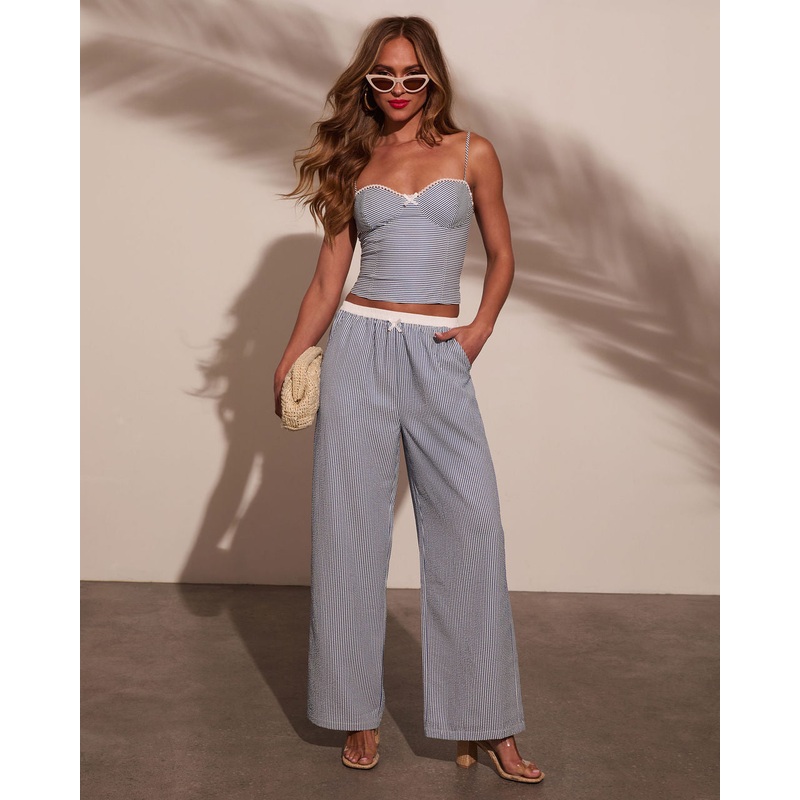 The Sarahphina Striped Wide Leg Pants bring breezy charm with a modern twist. Made from airy seersucker and finished with an easy pull-on elastic waistband, these pants are made for days when looking chic feels effortless. The soft stripes keep it classic, while a dainty mini bow at the front adds just the right touch of feminine flair. Pair them with the matching Sarahphina Striped Sweetheart Tank for a polished two-piece set.Seersucker fabric