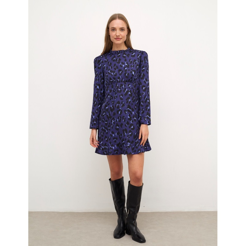 In leopard satin jacquard, our purple Sasha mini dress is always ready for the party. Pair it with platforms on the dancefloor.Round neckRuffled cropped sleevesUnderbust bandConcealed back zip