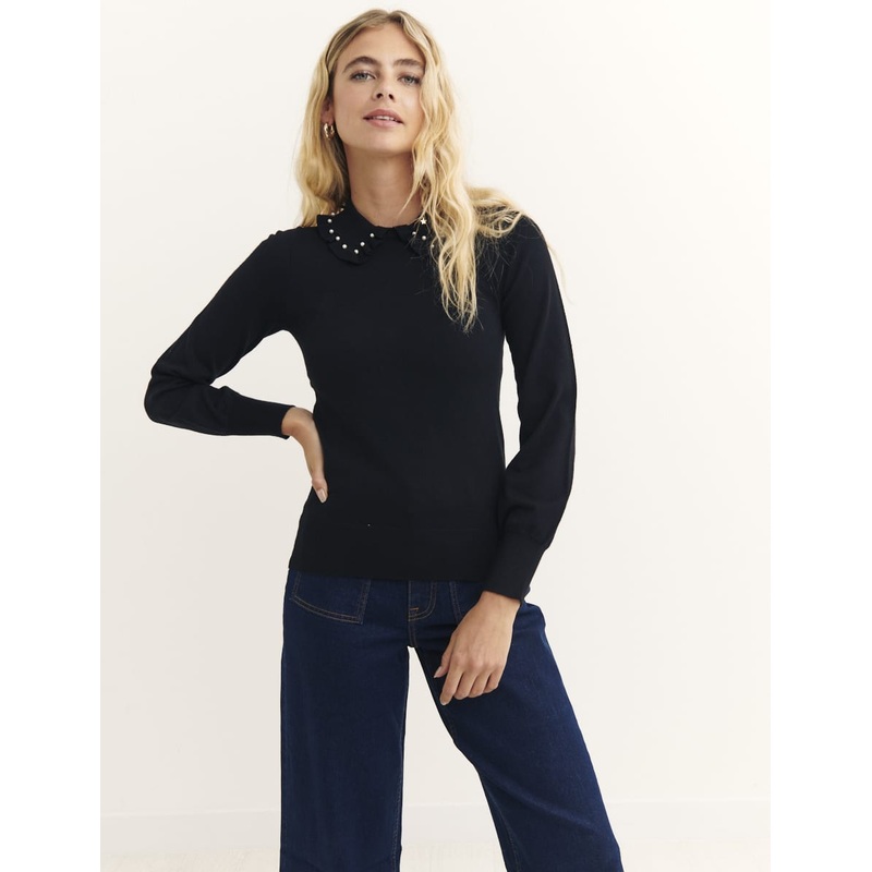 Minimal in design, this black knitted top is a must-have for your transitional and autumn wardrobe. Designed from a cosy fabric blend that will beat the chill for months to come, the knit plays host to blouson sleeves, a high neckline and cute pearls on the collar for an extra special touch.
