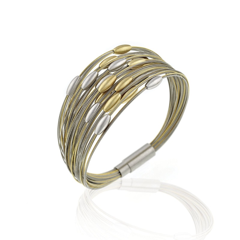 Multi-strand stainless steel bracelet, 18kt plated and steel with 18kt plated and sterling silver brushed olive elements.Magnetic Clasp.Nickel-Free, 100% Stainless Steel.Made in Germany.
