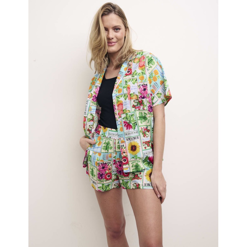 Look closely to find sunflowers, strawberries, radishes and more all homegrown by the NC design team. The open collar and boxy cut lends itself to relaxed days. Were wearing ours with a square neck cami and the matching co-ord shorts for festivals, park dr