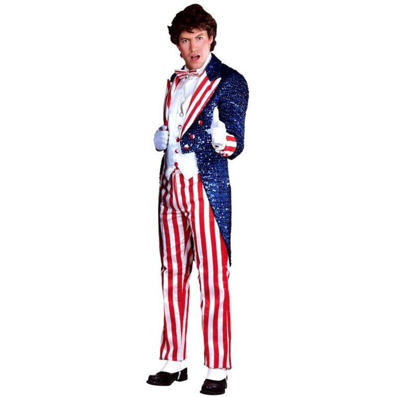 Includes: Blue sequin jacket with red & white satin lapels, cuffs & buttons. White satin vest front & red & white satin pants.Color: As ShownSize: S (34-36), M (38-40),L (42-44), XL (44-46)R90808