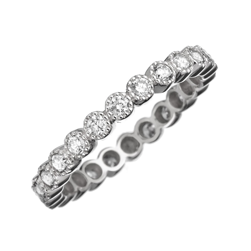 With a subtle vintage allure, this sparkling 18K white gold bezel-set diamond eternity band with accented milgrain detail is a perfect stacking ring and looks beautiful worn on its own. 0.70cttw.
