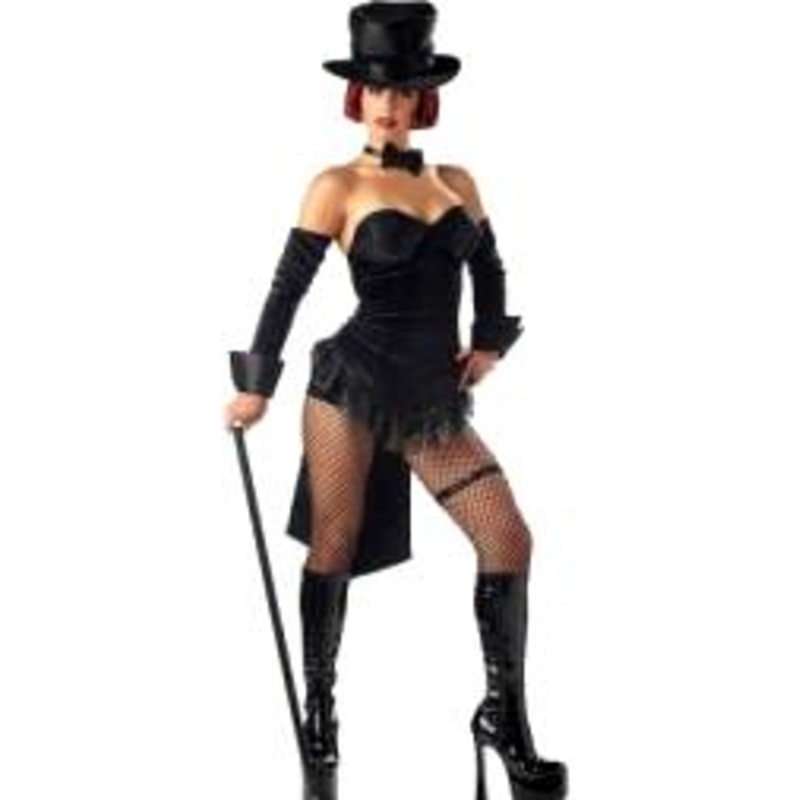 Includes: Black velvet like strapless mini dress with bottom sequin trim, matching black hot pants,top hat, bow tie, glovelettes with sequin cuffs & elastic sequin garter.