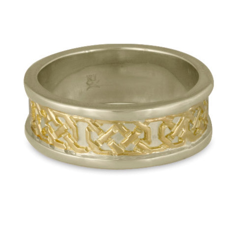 The Shannon ring displays a complex, yet harmonious pattern of contiguous knot work. The lines intertwine so closely, that it's hard to tell where one begins and the other ends. A strong metaphor for two paths that have grown closely to one another. 18K Ye