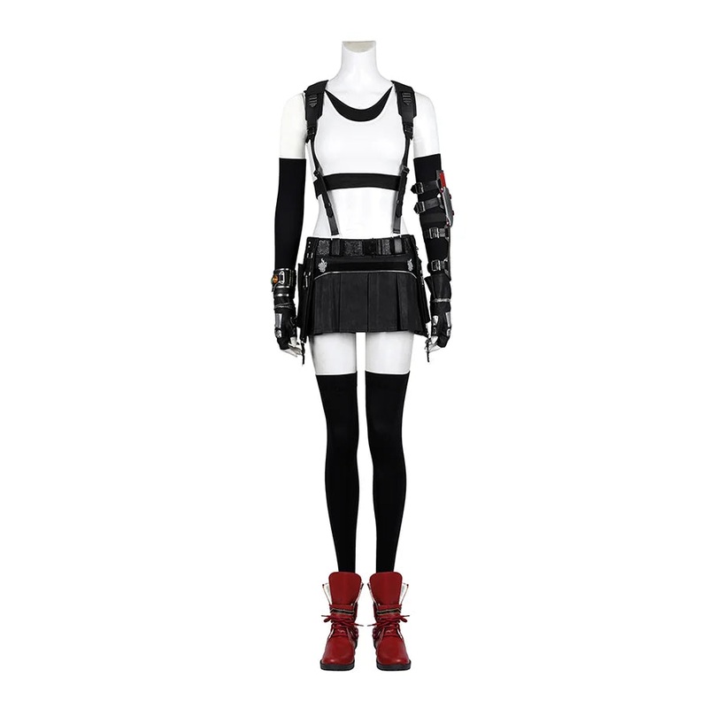 Includes:Skirt, tank tops, bottoms, thigh socks, cuffs, belts, gloves, arm guards, bracelets , wrist guards, earrings.