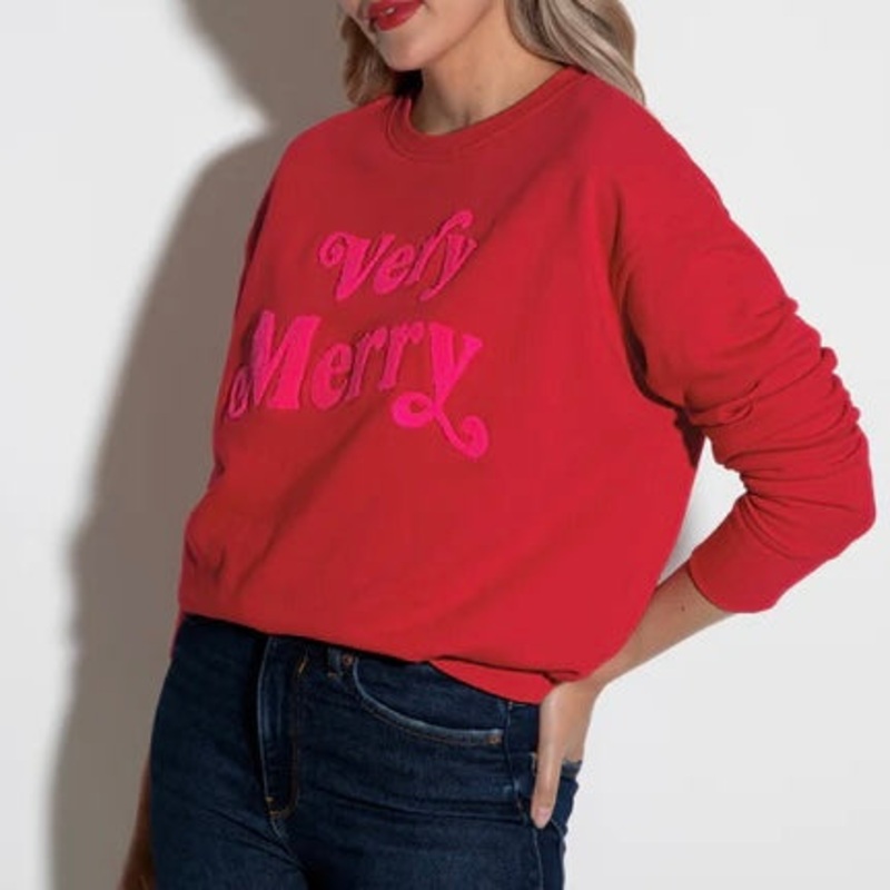 Very Merry Sweatshirt. Whether youre working from home or enjoying your Sunday slumber this holiday season, you will appreciate the collection of pieces from Shiraleah that make you feel good. The red colored "Very Merry" Sweatshirt is made of lightweight