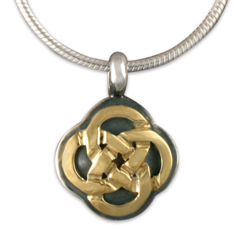 For those who enjoy jewelry that's intimate and meaningful, this subtle, two tone Sita Pendant features an ancient Celtic knot, in solid 14K gold, overlaid upon antiqued sterling silver. The design motif symbolizes growth and evolution in relationship. 14K