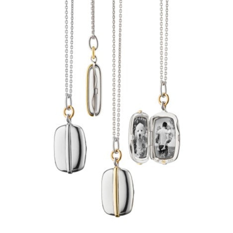 This 18 karat yellow gold vermeil over sterling silver cushion deco locket features light and dark green enamel. The locket comes with a 17 inch black steel chain and an 18 inch grey cord.