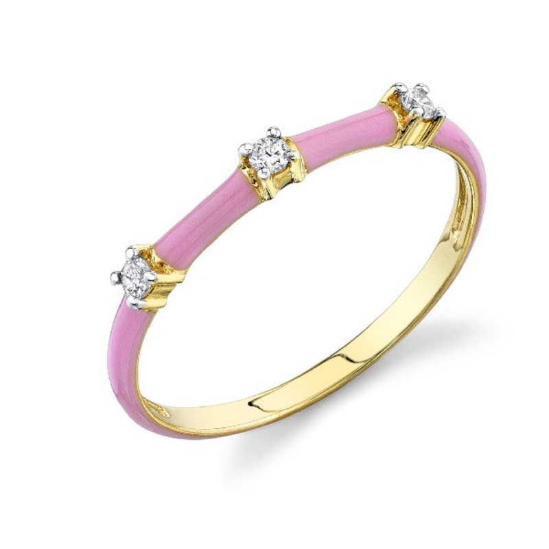 18K yellow gold stackable band with pink ceramic and diamonds. 0.07cttw.