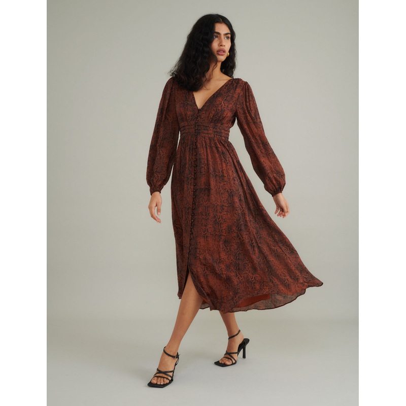 Animal print is in. This midi is cut with plenty of classic NC features: long puff sleeves, a panelled waist and a button front. Dont miss the black and tan colour theme. Style yours with Mary-Jane shoes.V-neckLong puff sleevesButton frontConcealed zip fas