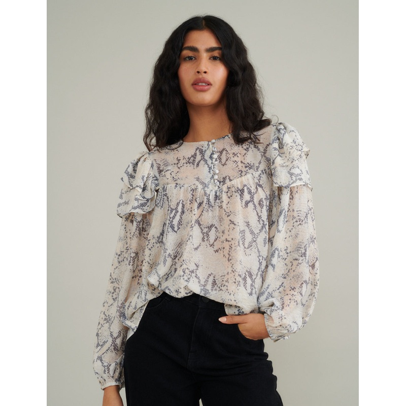 Were obsessed with this elevated blouse. In an on-trend snake pint, our blouse features long balloon sleeves, flouncing ruffles and a free-flowing shape, this is that little something extra youve been looking for. Wear yours with a touch of gold and a dash of denim.