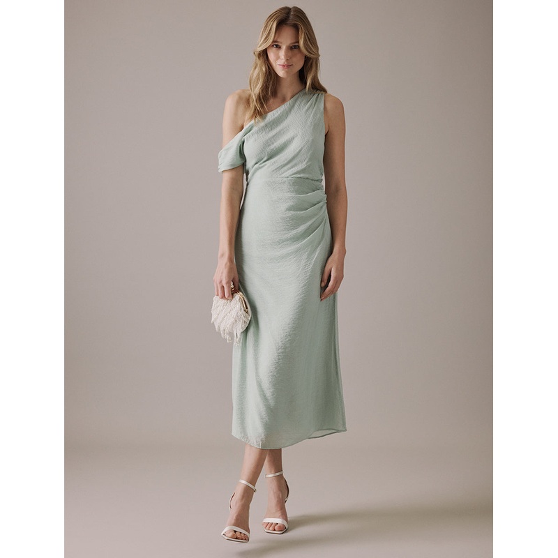 For the I do crew. Walk down the aisle in style with the NC bridal party collection. Coming in green, Skylar is a one shoulder midi dress with an A-line skirt that skims the body. Style her with barely-there sandals and a bouquet.One shoulder styleConceale