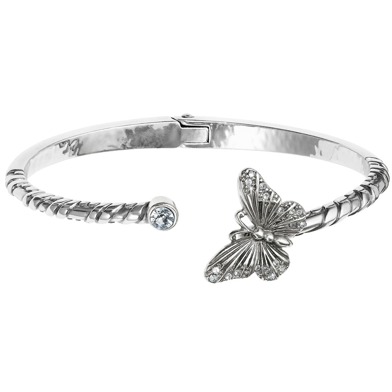 When wearing this hinged bangle, its butterfly sits atop your wrist, looking as though it alighted there for just a moment. Shimmers with handset Swarovski.