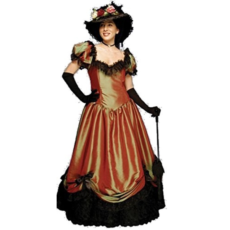 Includes: Fabulous gown with fitted bodice, attached full length petticoat, lace flounce at hem and black lace trim at neck, hem and edge of puffed sleeves. Can be worn on or off shoulder.Color: CopperSuperior Quality / Made in USASize (Bust): S (34), M (3
