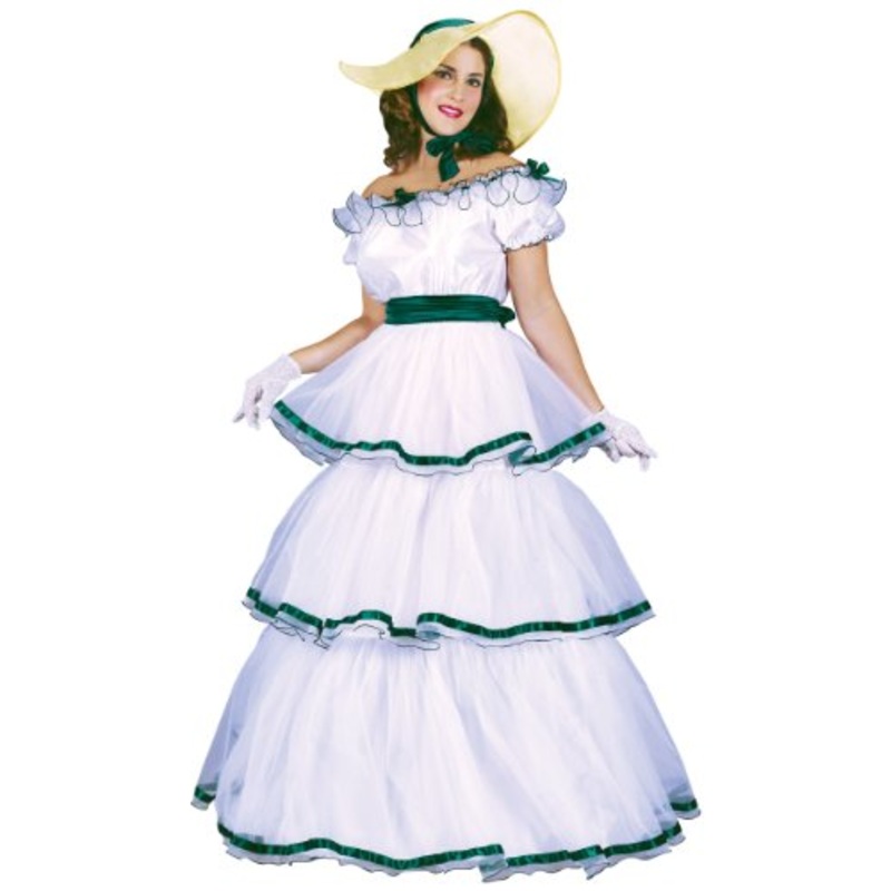 Includes: Includes 3 level tiered gown with green trim, hooped under skirt, and matching waist sash.Added bonus! matching picture frame hat.Color: White w/Green trimSize: S/M (2-8), M/L (10-14) Bust: 38"FW5054