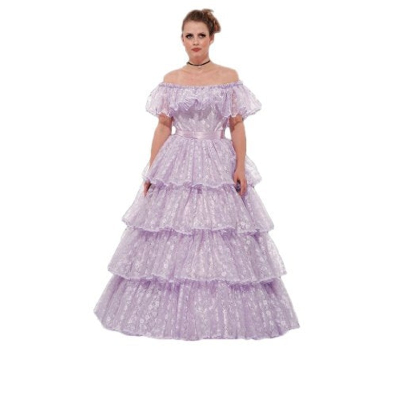 Includes: Lovely lace gown features ruffles edged with lace, satin belt and back zipper. Can be worn on or off shoulder.Color: Lilac, BlueMade in USA / High-quality fabricSize (Bust): S (34), M (36), L (39)If you enjoy historical reenactments or belong to