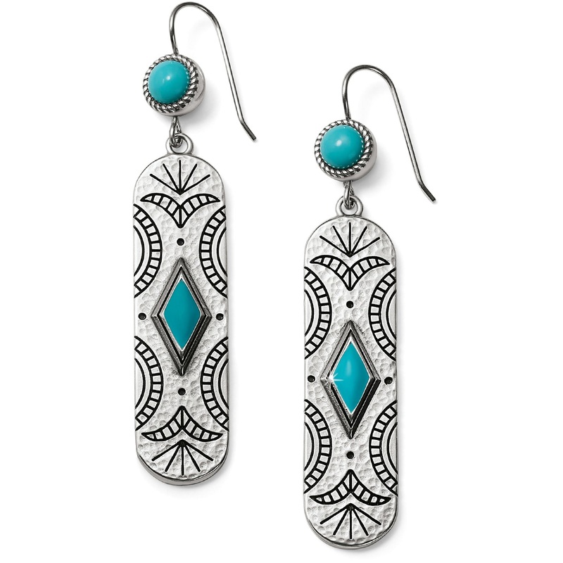 Go west, chic woman, with these Southwestern-inspired drop earrings, etched and embellished with turquoise-hued enamel.