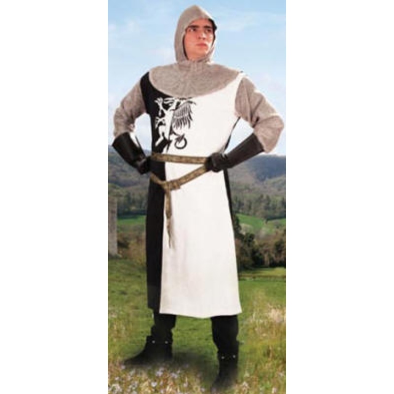 Includes: Soft 100% cotton tunic accented with the coat-of-arms on the front, attached polyester faux steel chain mail sleeves, faux chain mail coif, and matching medieval knightly belt. A hidden zipper in the back allows for easy on-and-off.