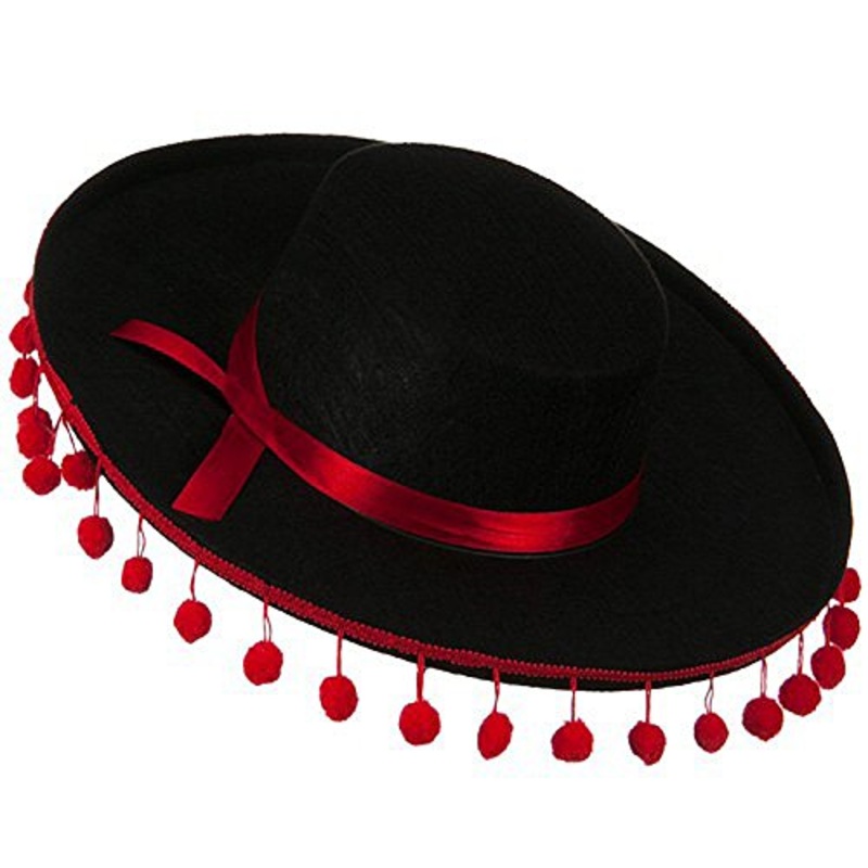 Spanish style hat with Red Ball Fringe / Pom Poms, Red Satin Band and a stitched design on the brim.Size: One Size / Size 7 1/8 / Measures 22.5" inside.Color: Black with Red Band and Red Ball FringeMade from 100% Polyester.J21300