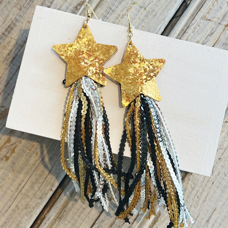 Star Fringe Earrings.Black and Gold Star Earrings.