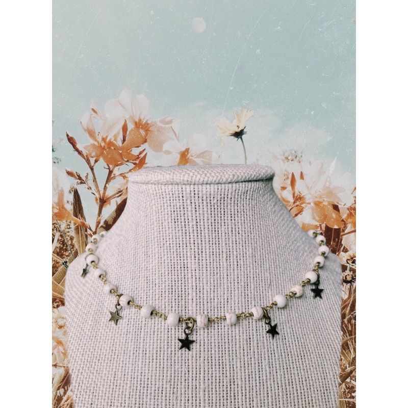handmade white beaded necklace with star dangles