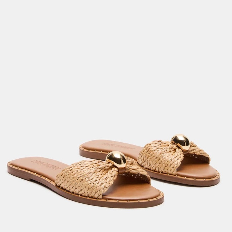Steve Madden Dipsy Sandal in natural raffia. This Dipy sandal features mini studs and a rounded toe for added style and comfort. The perfect combination of fashion and practicality, these sandals are a must-have for any wardrobe. With their natural raffia