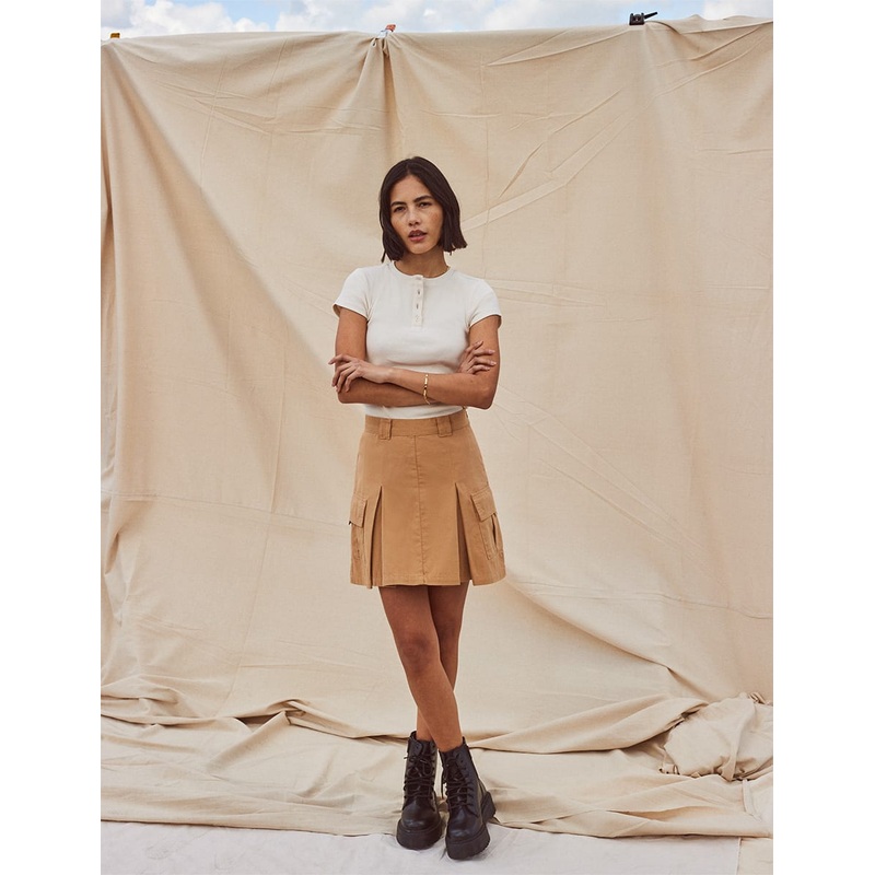 Precious cargo comes in the form of this seasons utility-inspired mini. With 90s flare, this stone pleated skirt is stitched with pockets and chunky belt loops. Team yours with slides. This skirt is true to size if you want it to sit on your hips.