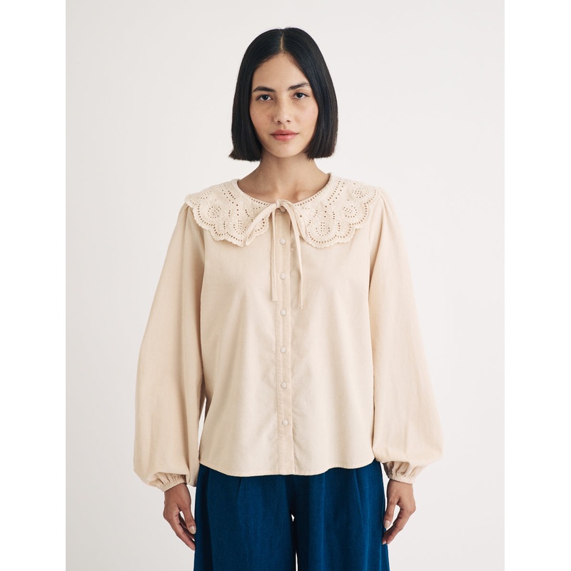 The perfect blouse for autumn. This one comes in dark cream colour. Decorated in a stylish drop collar and string tie detailing, make sure to add to bag immediately. Style yours with denim to complete the look.