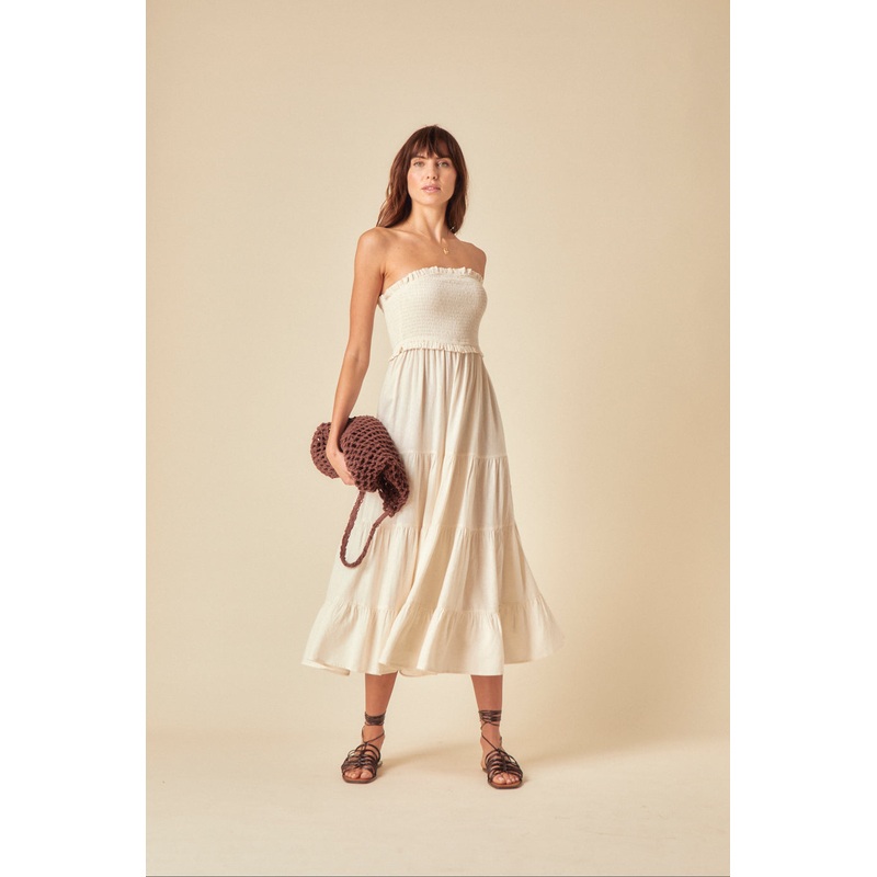 Float around in this white sundress with a bandeau neck, shirred bodice, and tiered skirt. Shes the perfect summer dress to take you from day to night.