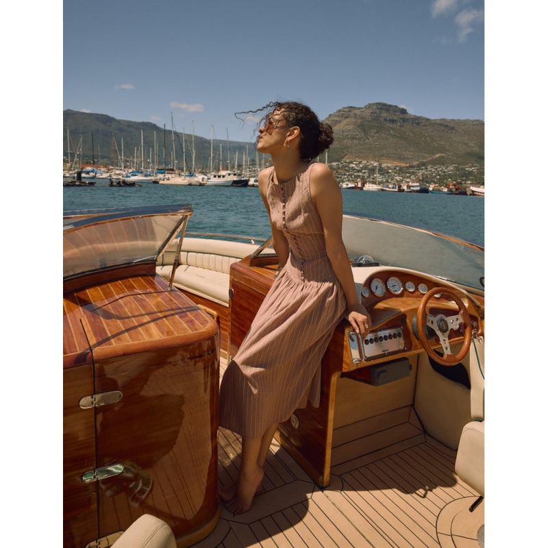A midi dress you didnt know you needed. Coming in cream and white stripes, we love the stylish button front and the flowing skirt for that elegant look. Style yours with strappy sandals. Boat neck Button front Relaxed skirt that skims the body Concealed zi