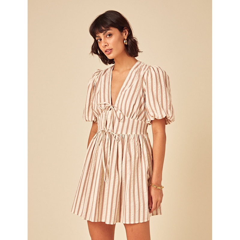 The effortless one-and-done. Coming in soft stone and white stripes for an easy summer feel, our Scarla mini dress features tie-front detail, short puff sleeves and a relaxed fit. Just add sandals.