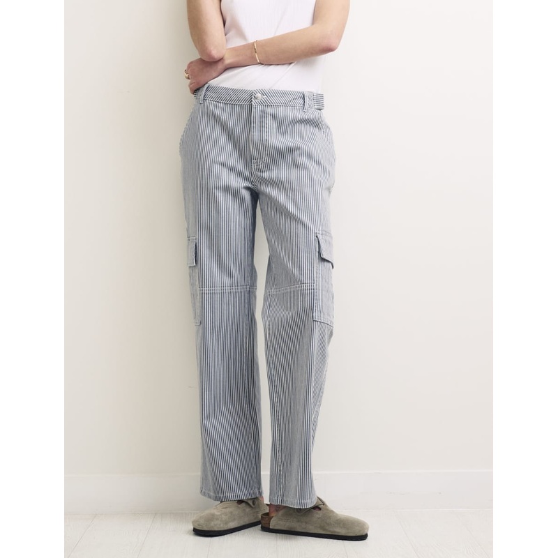 Everything you love about your jeans in a cargo style cut. These denim straight leg trousers are this seasons must-have in a blue and white pinstripe.Straight leg cutFront and back pocketsSide pocketsBelt loopsNC buttonZip fly