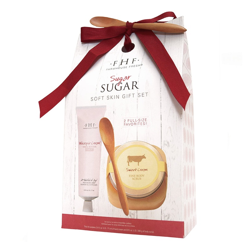 6 oz. Sweet Cream Scrub + Whoopie! Shea Butter Hand Cream92-95% NATURAL | VEGAN | GLUTEN-FREEGive our sweetest gift set to those you love! This box gift set includes our customer-favorite Sweet Cream Fine Body Scrub and Whoopie! Shea Butter Hand Cream, hou