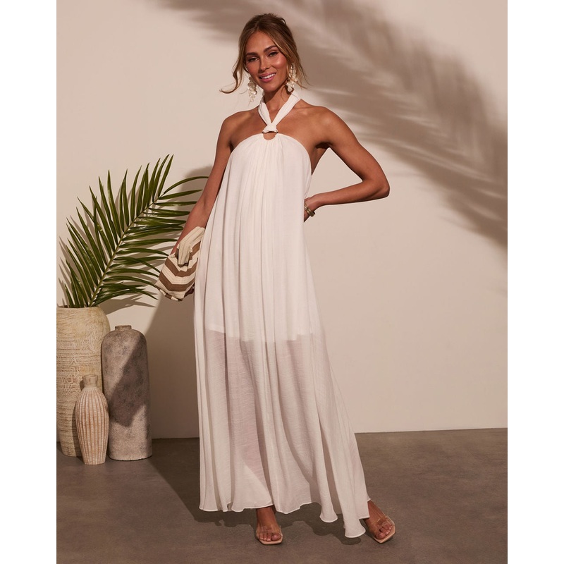 A breezy showstopper made for dreamy getaways and golden hour moments, the Sun Chaser Halter Maxi Dress is the perfect selection. Designed with lightweight crinkle gauze fabric, this dress flows beautifully with every step, keeping you cool and chic all day long. The halterneck tie closure adds a touch of elegance, while the ring hardware at the neckline brings a modern, beachy vibe thats impossible to resist.