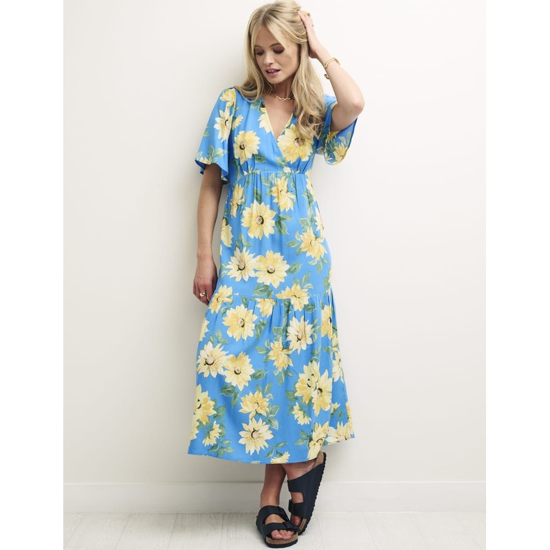 Swish around in this sunflower decorated dress. Clementine falls into a subtle v-shape with draped, fluttering sleeves. Along the hem, an oversized tier creates a soft billow as you walk. Just add sliders for beach walks that end with an ice-cold drink.