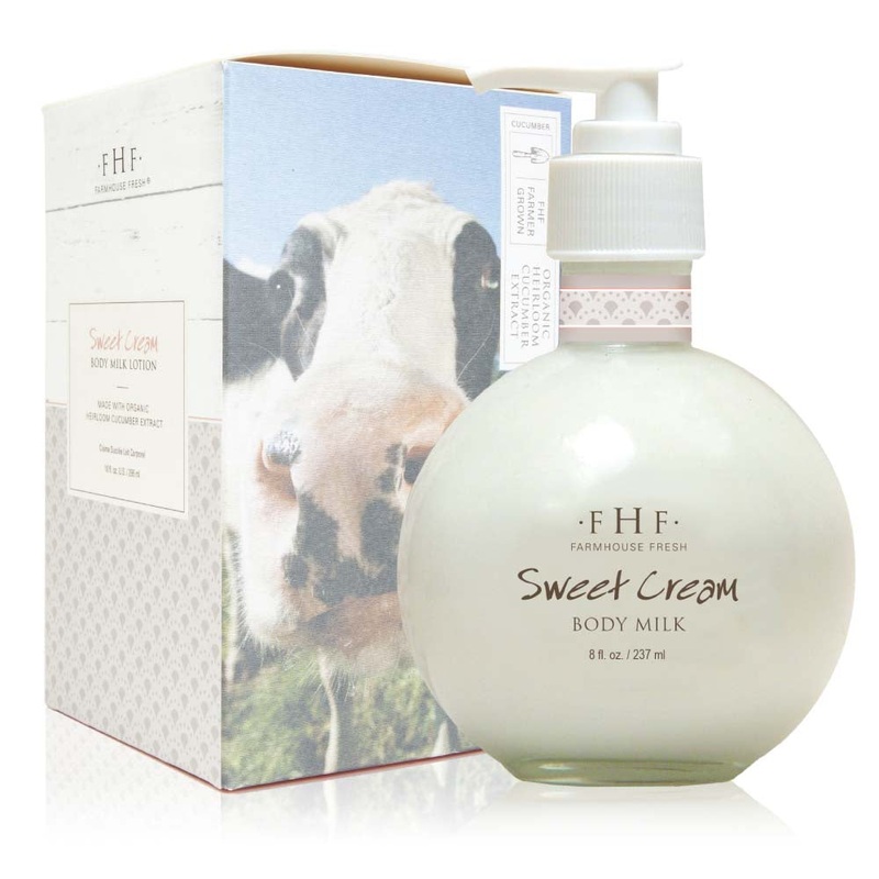 Sweet Cream Body Milk is infused with a blend of natural oils that provide lasting softness to skin: Vitamin E-rich Rice Bran oil, JojobaSeed oil, Sweet Almond, Avocado and Sesame. The formulation also includes our FarmHouse Fresh-grown heirloom organic cucumber extract with soothing antioxidants.