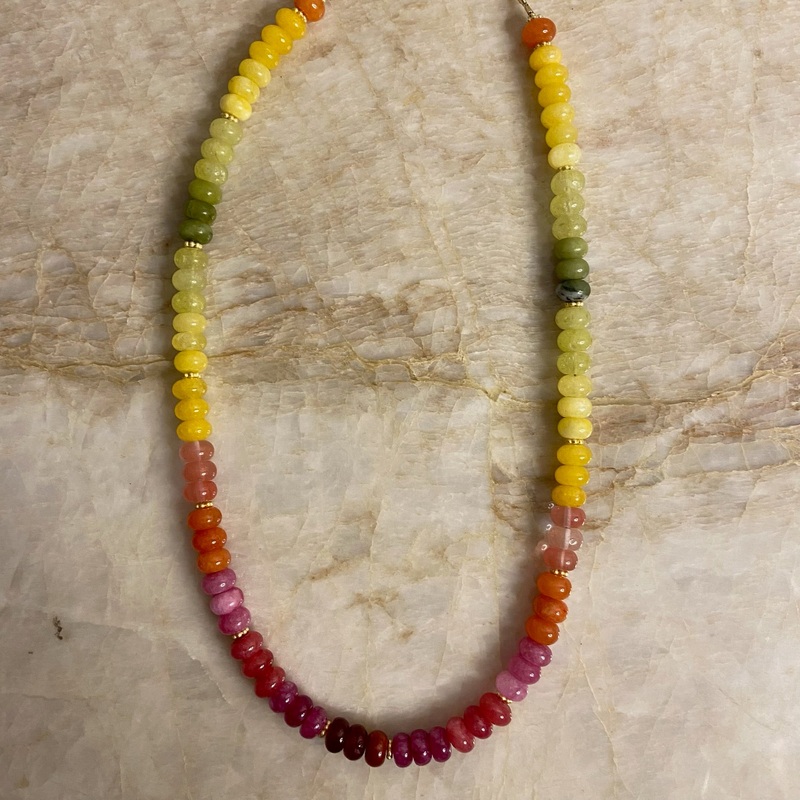 This is a mixed patterned beadednecklace. It is roughly 18in with a 3in extender. Great for layering ormaking a statement