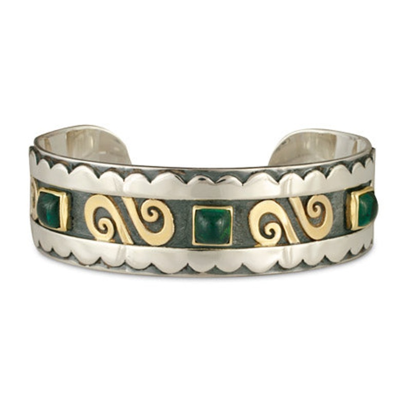 A cuff of precious gems and metals, swirls and scalloped borders. The Swirl Cuff is bracelet which emulates both feminine and masculine design. The detail that runs along the inside of the cuff just adds to its creative look, and tiny spheres of gold sit a