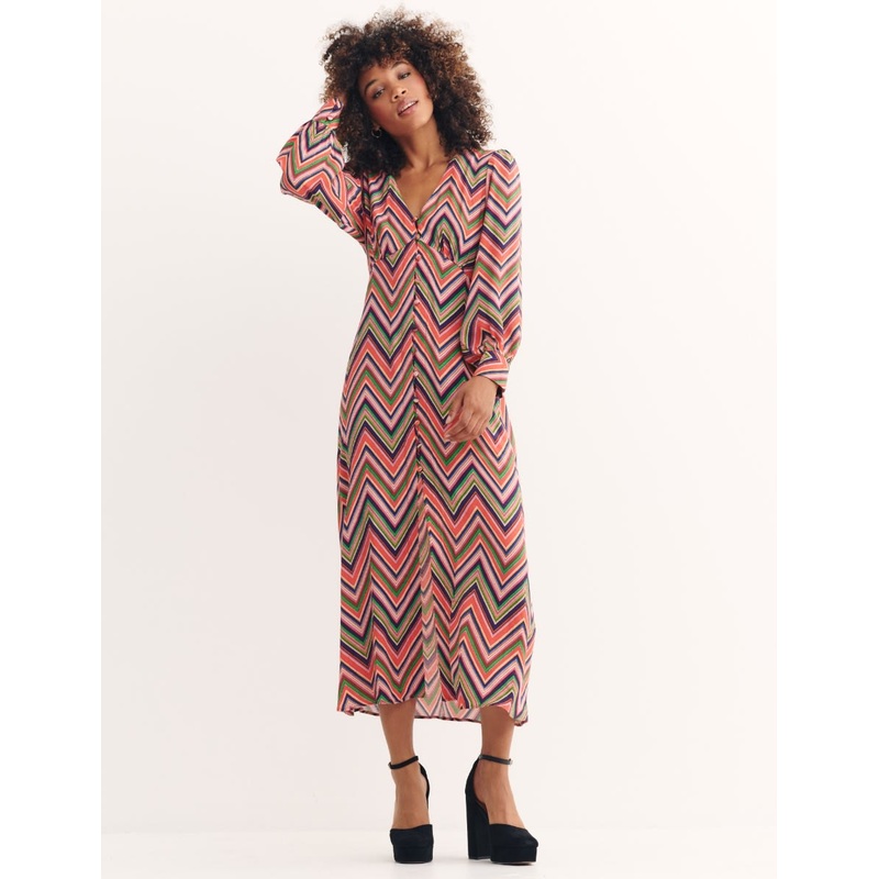 Meet the Tasha dress, a retro-inspired midi that will suit special events and chilled days too. Designed from an Ecovero Lenzing blend, the dress features striking zig-zags in a multicoloured palette, a skimming fit and a button-through front. Pair with ch