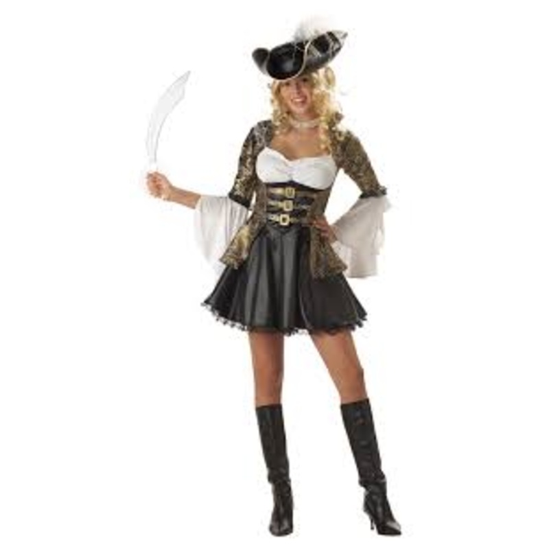 Includes: Metallic gold/silver poly brocade coat dress accented w/decorative buckles, attached skirt, ruffled underskirt & hat w/plume.(4 pieces)Color: Gold/Silver/Black (shown)Teen (Junior) Size: Jr 3-5, Jr 5-7