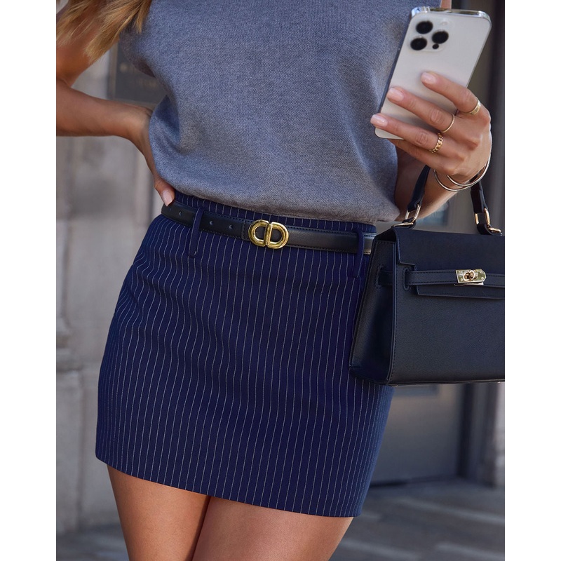 Introducing The Adams Pinstripe Mini Skirtwhere classic meets chic for the fall season! Crafted from premium suiting fabric, this mini skirt flaunts a sophisticated pinstripe pattern thats perfect for the crisp autumn air. Its hidden side zipper ensures a