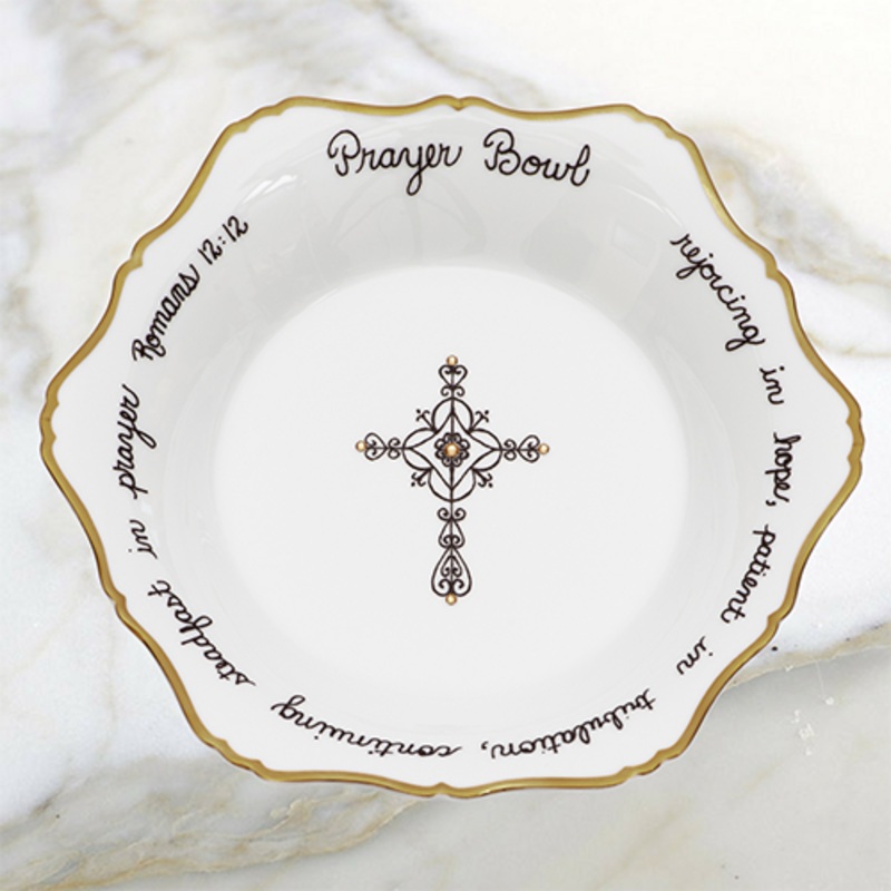 The Celeste Bowl will quickly become treasured in your home. With itsintricatecross, gold-scalloped edge, and five hand-applied Swarovski Crystals, this PrayerBowl is both elegant and graceful. Romans 12:12 Rejoicing in hope, patient in tribulation, contin