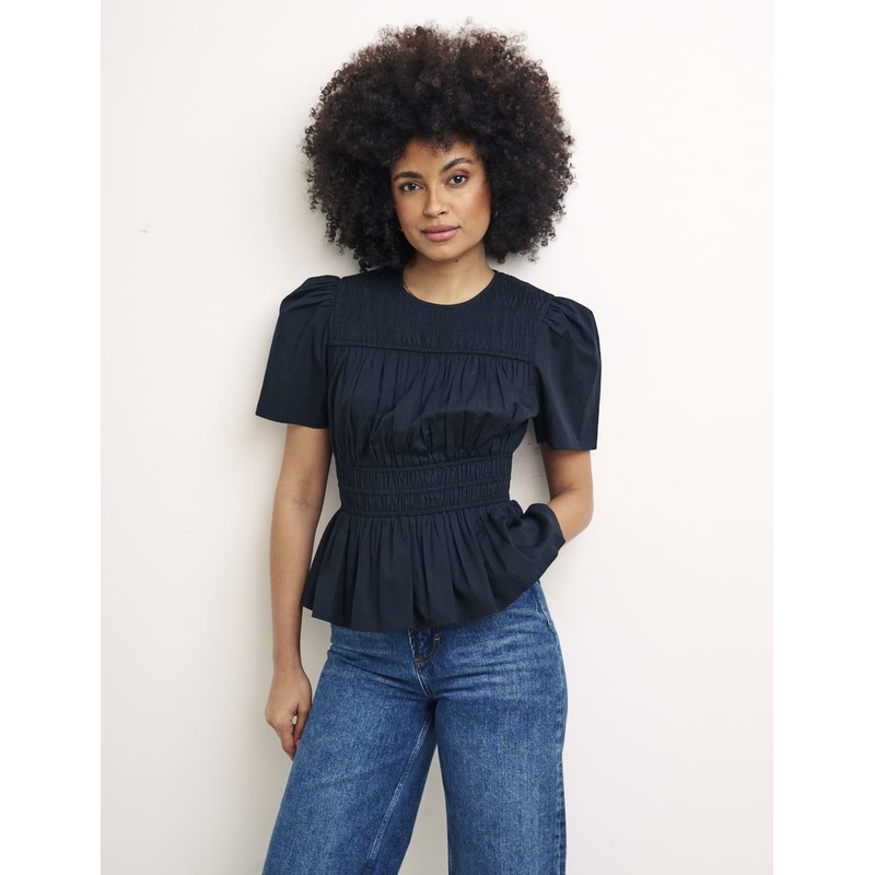 That cute top youve been looking for. Thea comes with gentle shirring and a flouncy peplum hem for a fit that always flatters. We love her with jeans.Round necklineShort sleevesShirred yoke panel detail on the front and back of the bodicePeplum hem that de